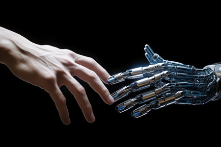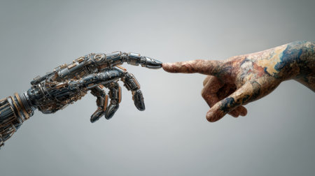 A hand reaching out to touch a robot arm, AI