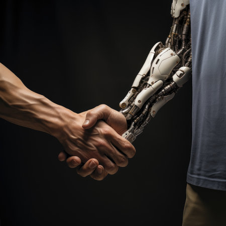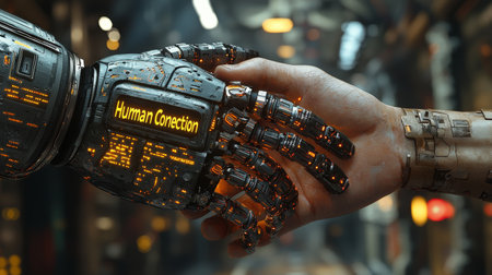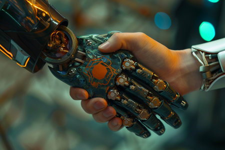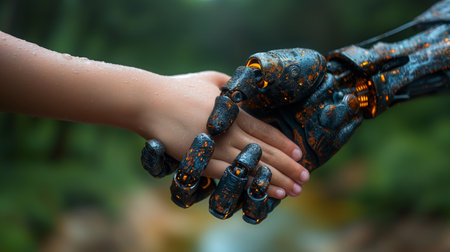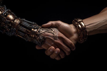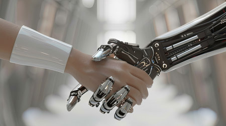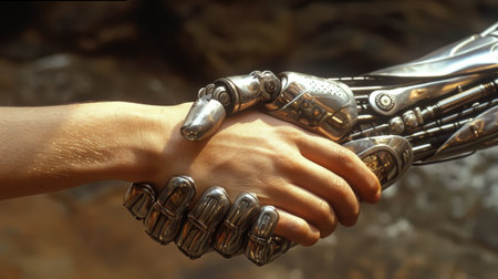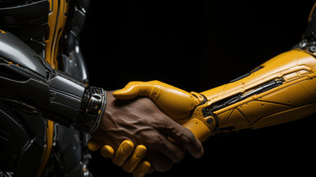 A human hand and a highly advanced robotic hand in a handshake, representing the blending of human capabilities with robotic technology. generative ai