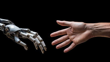 human hand reaching towards a detailed, mechanical robotic hand, symbolizing human-robot interaction