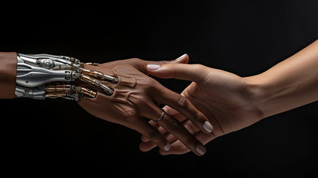Close-up of human hand holding robot arm. Black background. AI generative