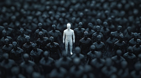 A single white figure standing out in a crowd of black figures, creating a striking abstract image that emphasizes individuality and contrast.