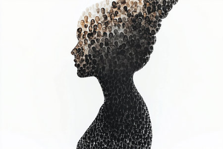 Artistic silhouette of a woman composed of diverse faces showcasing individuality and beauty, perfect for concepts of identity and community