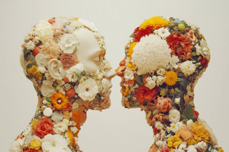 Two floral sculptures kissing, symbolizing love and connection through vibrant flowers and natural elements A blend of textures and colors creates a serene atmosphere