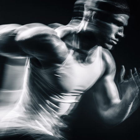 Close-up view depicts a figure in motion, showing the energy of athletic movement with strong contrasts and blurred details.