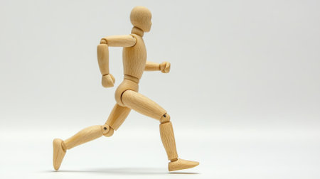 Dynamic wooden figure running in studio motion capture artistic display minimalist setting