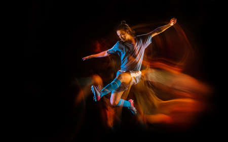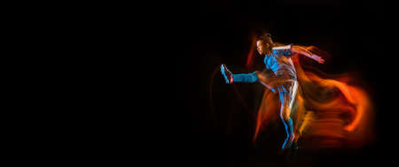 Jump high. Football or soccer player on black studio background in mixed light. Young male sportive model training in action. Kicking ball, attacking, catching. Concept of sport, competition, winning.