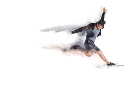 Male wear black shirt cloth is jumping break dance hip-hop excercise workout fitness healthy on white isolated background copy space creative banner poster graphic for advertisement sale promotion