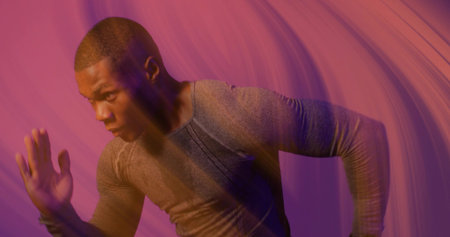 Sprinting fit Black male powering in studio, with fitted long-sleeve shirt and magenta lighting. Dash, athletic, motion, gradient, purple, dynamic, focus