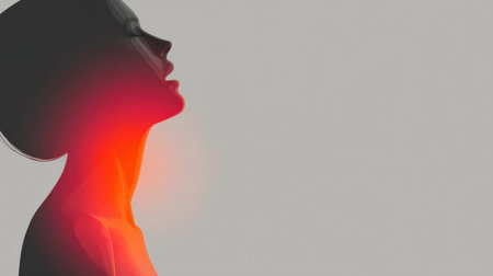 This artwork illustrates a sore throat concept featuring an animated glow emanating from the throat area, set against a clear minimalist backdrop.