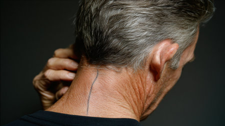 A man touches the back of his neck, revealing a noticeable line on his skin. The setting creates a calm atmosphere, highlighting his reflection in the moment.