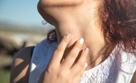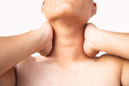 Female hand touching thyroid nodule. Medical, healthcare for advertising concept.