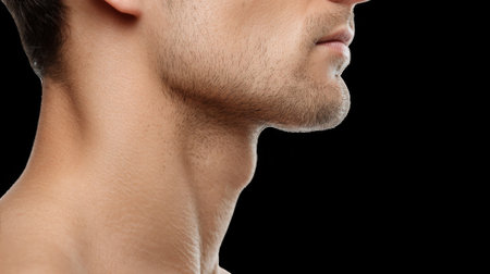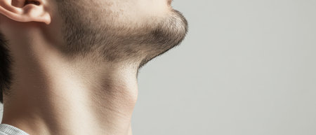 A young man gazes upward showcasing a clean shaven neck and subtle facial hair. The light background highlights his profile.