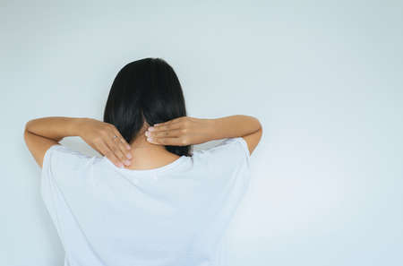 Woman with pain in the neck,Female hand touching and massage her painful cervix,Tendon inflammation