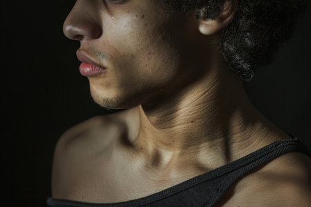 Bare expressive collarbones and shoulders of a young woman or girl in a studio on a black background