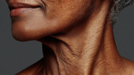 A detailed close-up image capturing the intricate textures and fine lines of aging skin on an elderly neck, highlighting its natural beauty and softness.