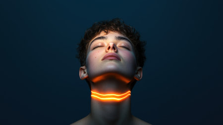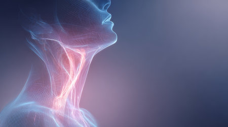 Transparent human neck anatomy with highlighted throat muscles and soft tissue in blue and pink light on dark background