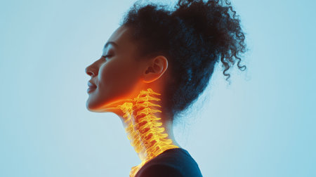 Young woman with a serene expression is shown in profile, her cervical vertebrae are highlighted, suggesting pain relief or a medical scan