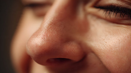Close up of a womans nose breathing, showcasing delicate skin texture, nostrils, and pores, highlighting beauty, skincare, and the sense of smell