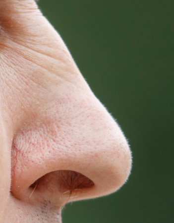 Close up of a caucasian mans nose, highlighting skin texture, pores, and subtle facial hair, potentially suitable for concepts related to rhinoplasty, cosmetology, or respiratory health