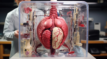 A model of a human heart is displayed in a lab, providing an educational tool for studying its structure and functions, The creation of an artificial organ, AI Generated