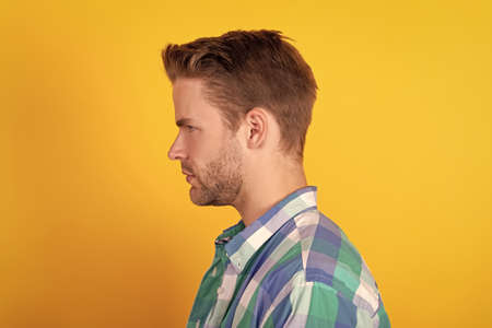 Serious millennial male with trendy dyed haircut wearing casual yellow shirt looking away against blue background