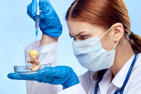 Beautiful woman on a blue background in medical clothes, petri dish, pediatrician, syringe, doctor, portrait, close-up.