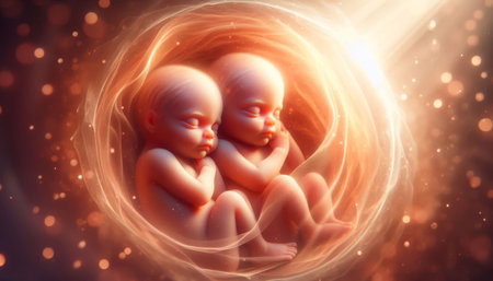 Twins in womb. Concept of pregnancy, prenatal development, motherhood, and beginning of new life in uterus.