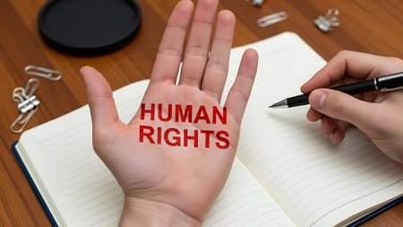 A person writing in a notebook with HUMAN RIGHTS on their palm, surrounded by office supplies.