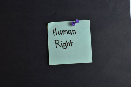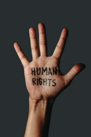 closeup of the open hand of a man with the text human rights written in his palm, on a dark gray background