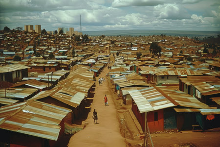 This aerial image showcases a densely populated urban settlement, illustrating the extensive housing structures and living conditions of many communities.