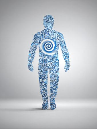 A striking figure composed of swirling blue patterns steps confidently across a smooth gray surface, merging art and individuality in a captivating way.