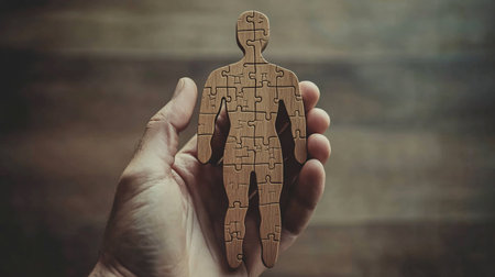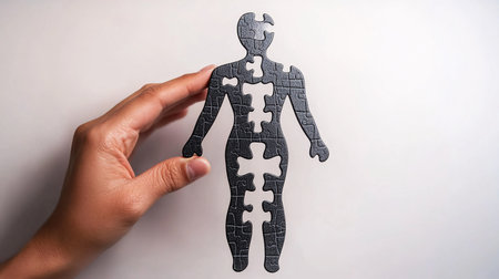A human figure made up of puzzle pieces, some in place and others scattered around