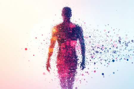 This striking image showcases a futuristic human figure composed of digital circuits and light particles, symbolizing the intersection of technology and humanity.