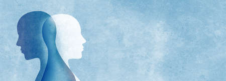 Metaphor bipolar disorder mind mental. Double face. Split personality. Concept mood disorder. Dual personality concept. 2 Head silhouette.Mental health. Imagination. Web banner. Copy space