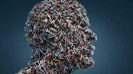 A close-up view of an abstract human head sculpture, featuring a mosaic of vibrant, multi-colored geometric shapes and patterns, representing complexity and diversity.