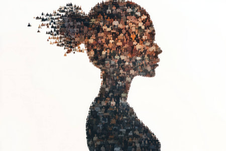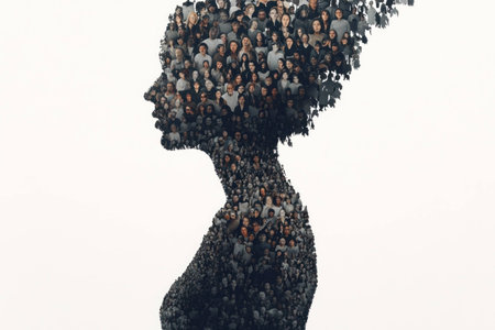 Profile silhouette of a woman filled with a mosaic of diverse faces, symbolizing community, identity, and unity in a modern artistic style