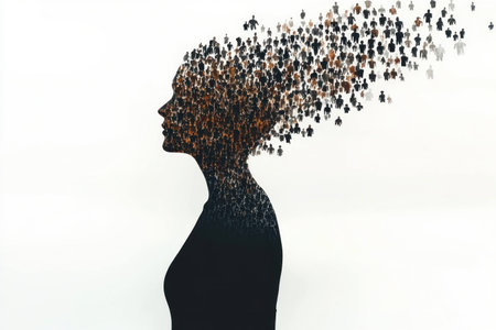 Silhouette of a woman with a flowing crowd representing unity, diversity, and community in a minimalist style, ideal for concepts related to social issues and mental health