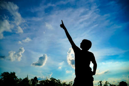 Silhouette of man posing at sunset sky background.