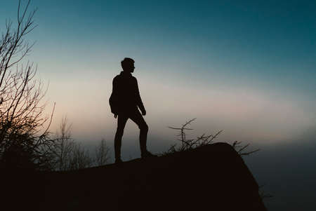 Silhouette of a man standing on a hill and looking at sunset
