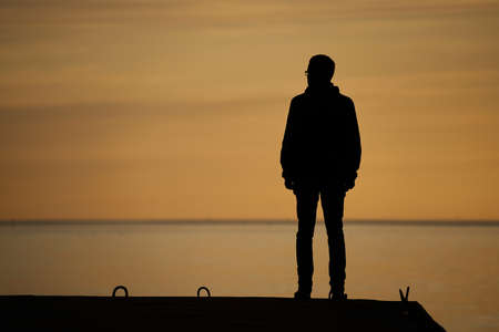 Silhouette of young man against beautiful sunset sky, anonymous person looking down, concept of sadness, loneliness, mental health issues or thoughtful introspection