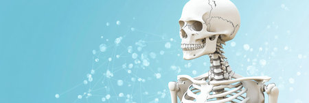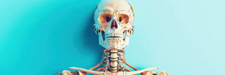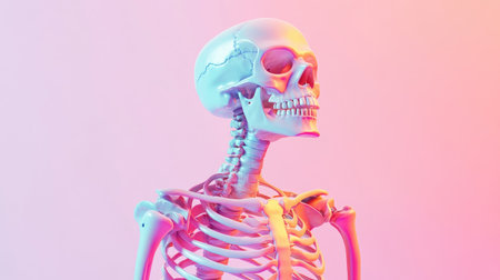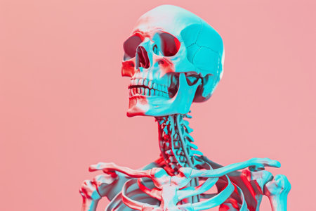 A vibrant 3D rendering of the human skeleton, showcasing its structure and interconnections, ideal for educational purposes in anatomy and physiology.