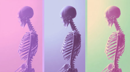 Three side views of a skeleton are displayed with different color panels, demonstrating posture comparison. One skeleton is in a standing pose.