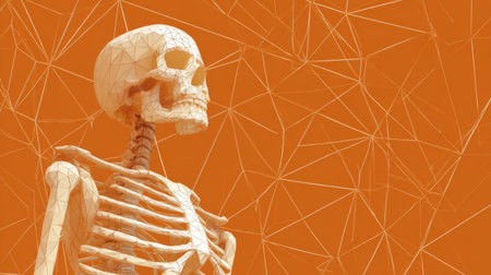 A low polygon rendering of a human skeleton is displayed. The skeleton is white against an orange background. Lines connect, forming a geometric design.