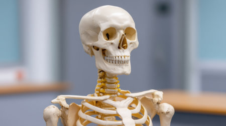 Detailed representation of a human skeleton model stands against a gray backdrop in a lab environment.