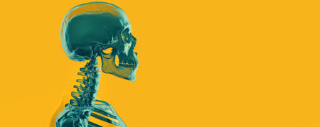 Side profile of a human skull and spine X-ray illustration on yellow background