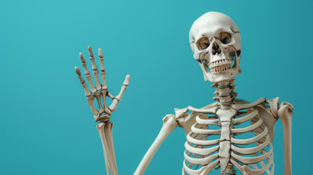 A human skeleton model waving its hand against a blue background, showing detailed bones