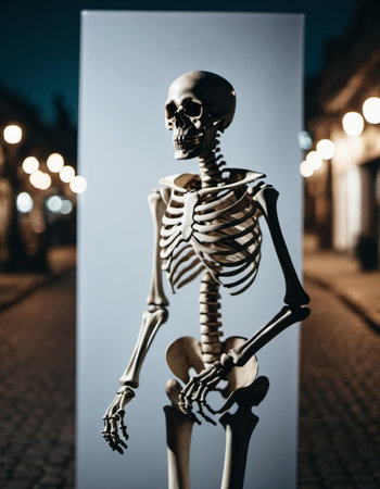This striking image features a highly detailed skeleton in the foreground, elegantly contrasted by a glowing silhouette of another skeleton in the background. The representation draws from science and medicine, adopting an innovative X-ray visual style that intrigues viewers. Perfect for those fascinated by human anatomy and the wonders of the medical field.