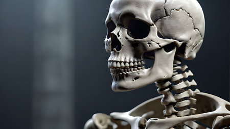 Side view of human skeleton model with dim lighting, anatomical study concept