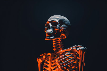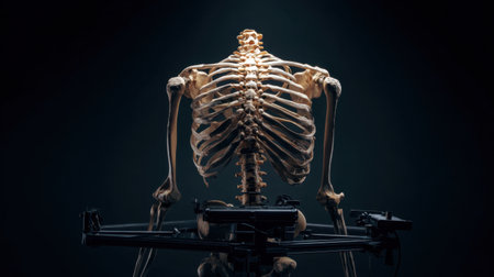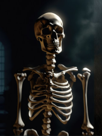 A detailed view of an anatomical skeleton model, perfect for educational purposes, highlighting the intricacies of bone structure in a captivating dark environment.
