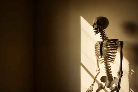 Skeleton illuminated by soft, diffused light. Casting dramatic shadows on the wall. Bones indoor close to wall. Generative AI